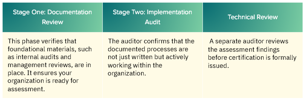That evidence period begins once key documents are dated. After that, Stage One and Stage Two audits can be scheduled, followed by a technical review. Most certificates are issued within one week of the review.
